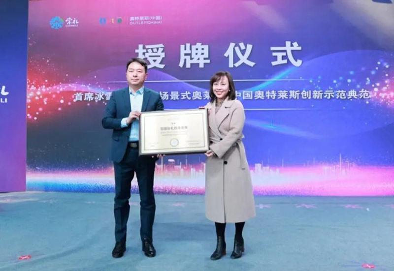 授牌儀式(圖左:中房智庫(kù)秘書(shū)長(zhǎng)鄧明政;圖右:奧特萊斯(中國(guó))品牌管理中心總經(jīng)理愛(ài)新覺(jué)羅·啟萱)