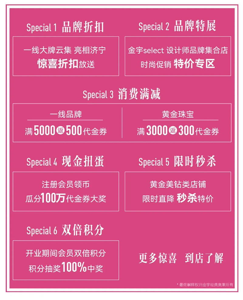 隨著金宇經(jīng)典奧萊的開業(yè),濟寧國際生活節(jié)正式拉開序幕。以回饋濟寧人為目的,制造濟寧人自己的時尚地盤,4.29-5.30盛惠不止狂歡不停,覆蓋五一黃金周,推出大量優(yōu)惠活動,時尚秀場、live演出、驚喜折扣、雙倍積分、現(xiàn)金扭蛋等,回饋廣大市民朋友!