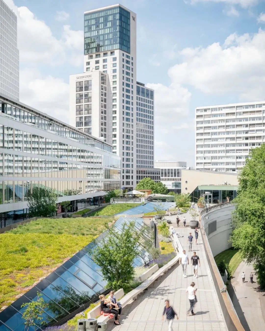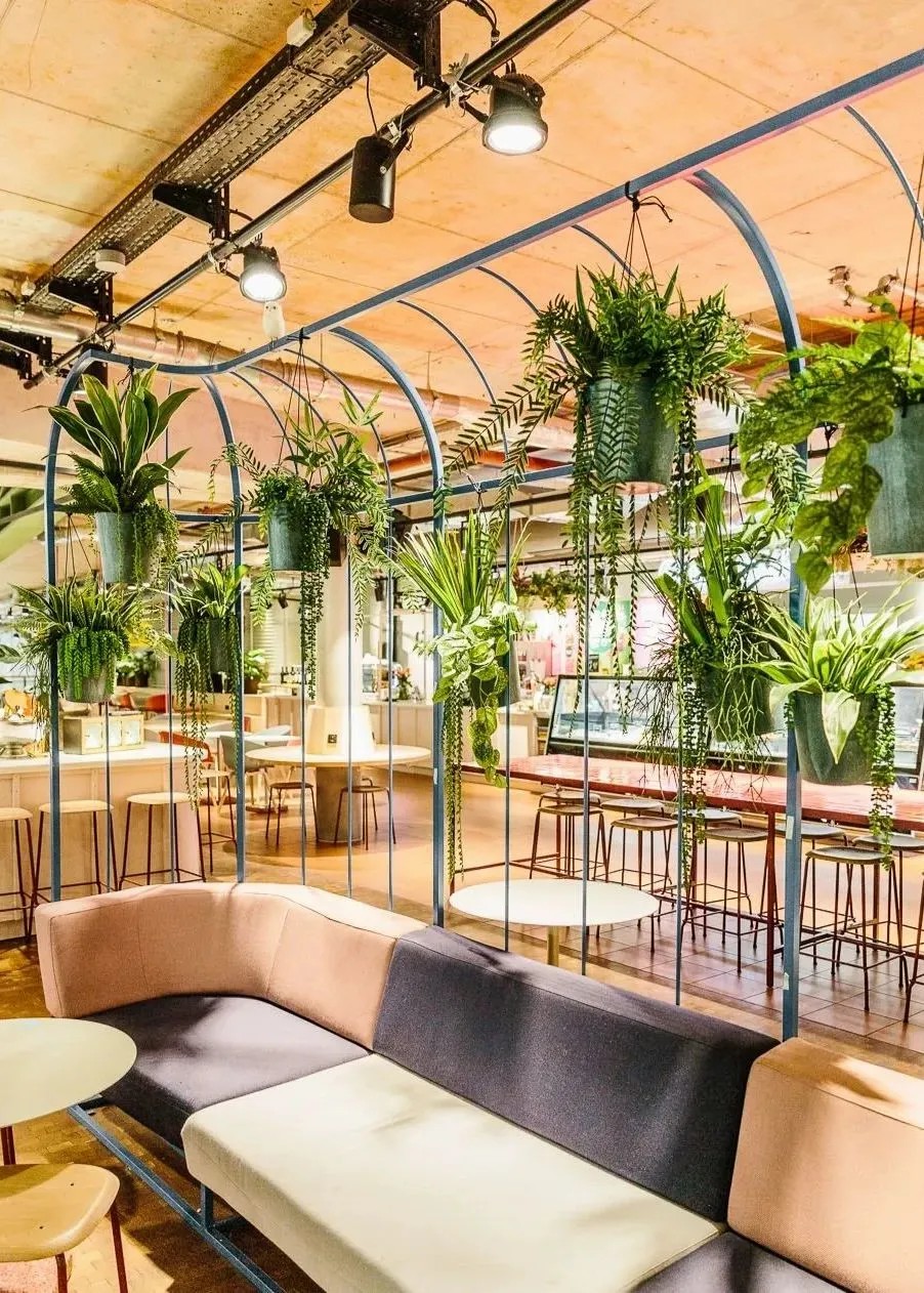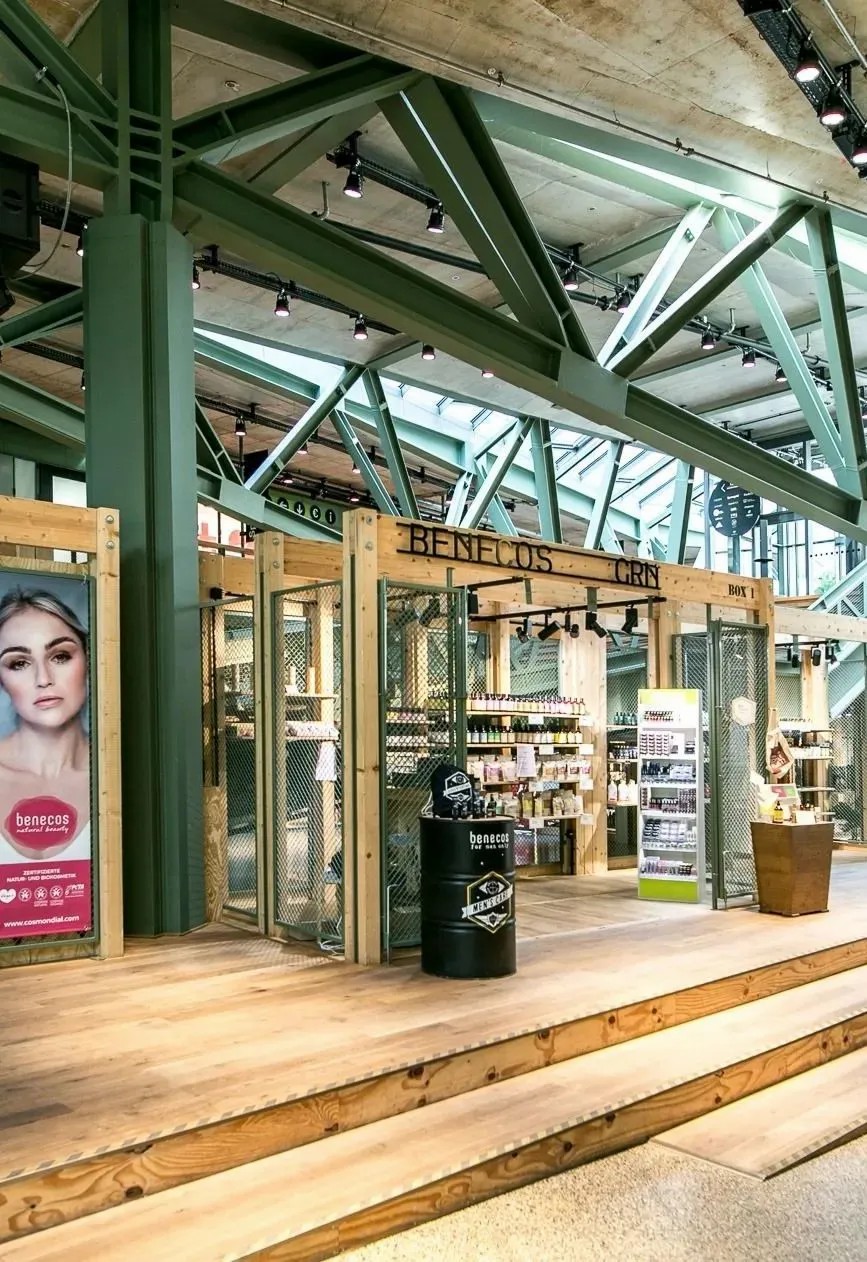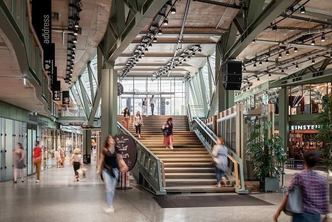 在商業(yè)的二層則設(shè)置了一個開放、通透的公共空間,同柏林潮流酒店25小時(Twenty five hours hotel)進(jìn)行聯(lián)通。并以城市綠洲為設(shè)計概念,在頂層設(shè)計了一個布滿植物盆栽的七千平方公尺的天臺,供給顧客休憩社交,營造自由、無拘束的商業(yè)氛圍,與項目的整體定位相得益彰。