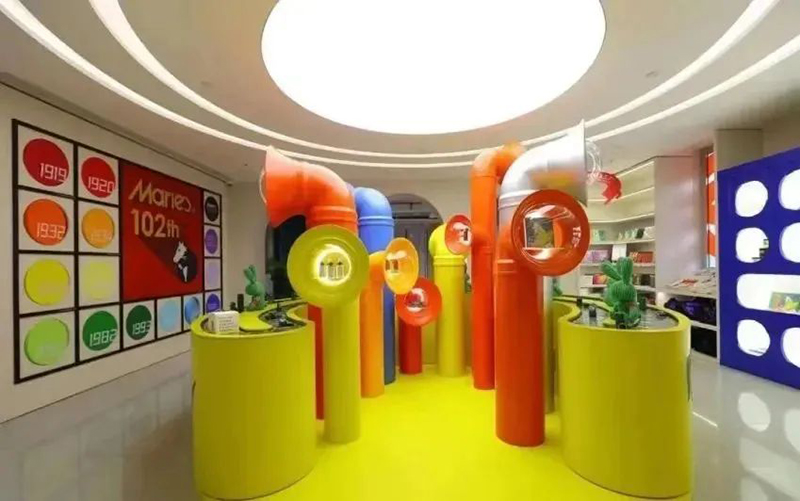 Mamǎfufú將“小紅閑”這一概念發(fā)揮得淋漓盡致,無論是整體的場景風(fēng)格,對于色彩的靈活運用,還是互動體驗的內(nèi)容和品牌首店引入,都創(chuàng)造了極高的出片效果,吸引眾多年輕人前來打卡消費。Mamǎfufú超級百貨是一個跨界聯(lián)合的潮流文創(chuàng)空間,占據(jù)了M+馬利位置最好的沿街二樓,無論室外的墻體,還是室內(nèi)的布置,均大面積運用了極具張力的紅黃藍三原色,將“馬利”這個百年顏料品牌的“色彩主義”貫穿于整體空間設(shè)計中。1000㎡的空間內(nèi)營造了8個主題區(qū)域,設(shè)置馬利趣味工廠、馬利畫材、POP-UP Market、色彩理想國、靈感書集、色彩生活集市、色彩沙龍等主題區(qū)域,涵蓋藝術(shù)展覽、手工工作室、畫材、圖書、生活家居、藝術(shù)衍生、服裝零售等多種業(yè)態(tài)內(nèi)容。