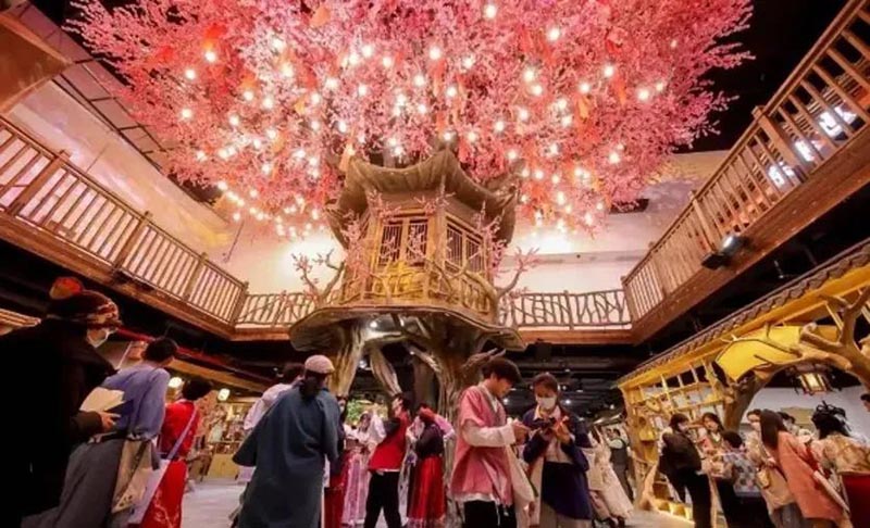 位于北京東三環(huán)富力廣場5層的大型沉浸式主題商業(yè)空間“戲精桃花源”,占地面積400多平方米,以桃花源為場景主題,在室內(nèi)打造了一個沉浸式娛樂休閑空間,將沉浸式場景、劇情演員、故事游戲、入駐店鋪,通過游戲串聯(lián)起來,消費者可以在真人NPC的互動和幫助下完成任務(wù),在游逛的同時還完成了游戲體驗。