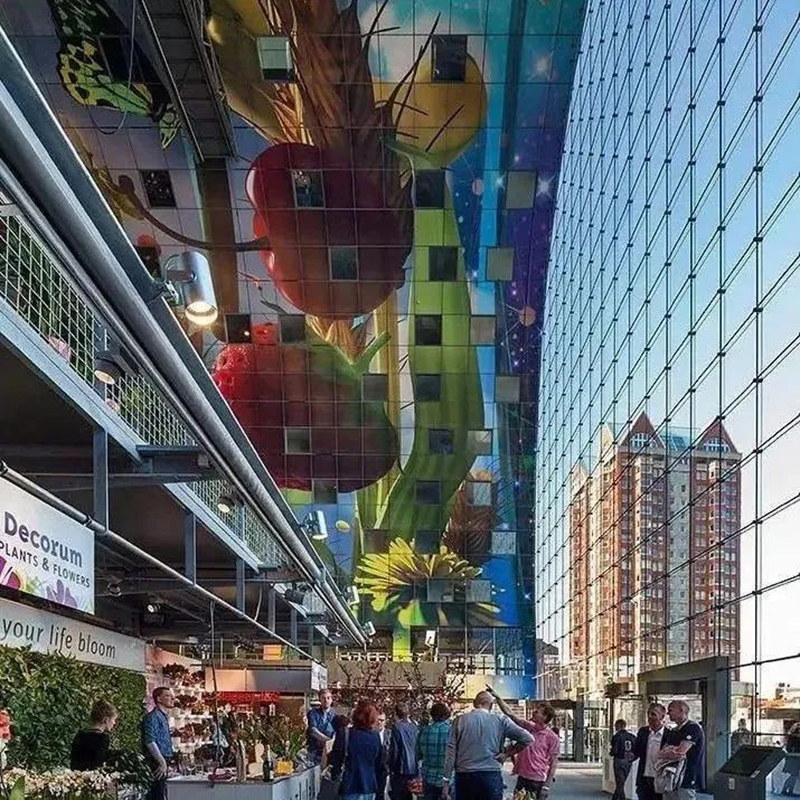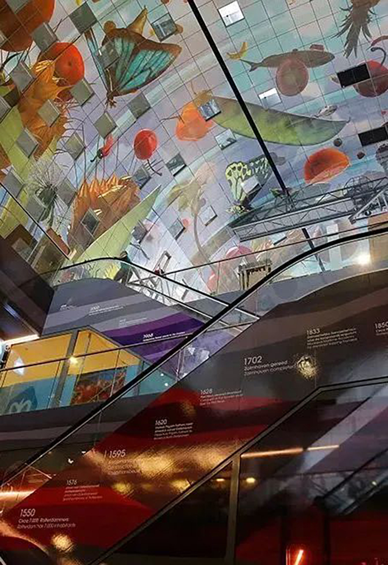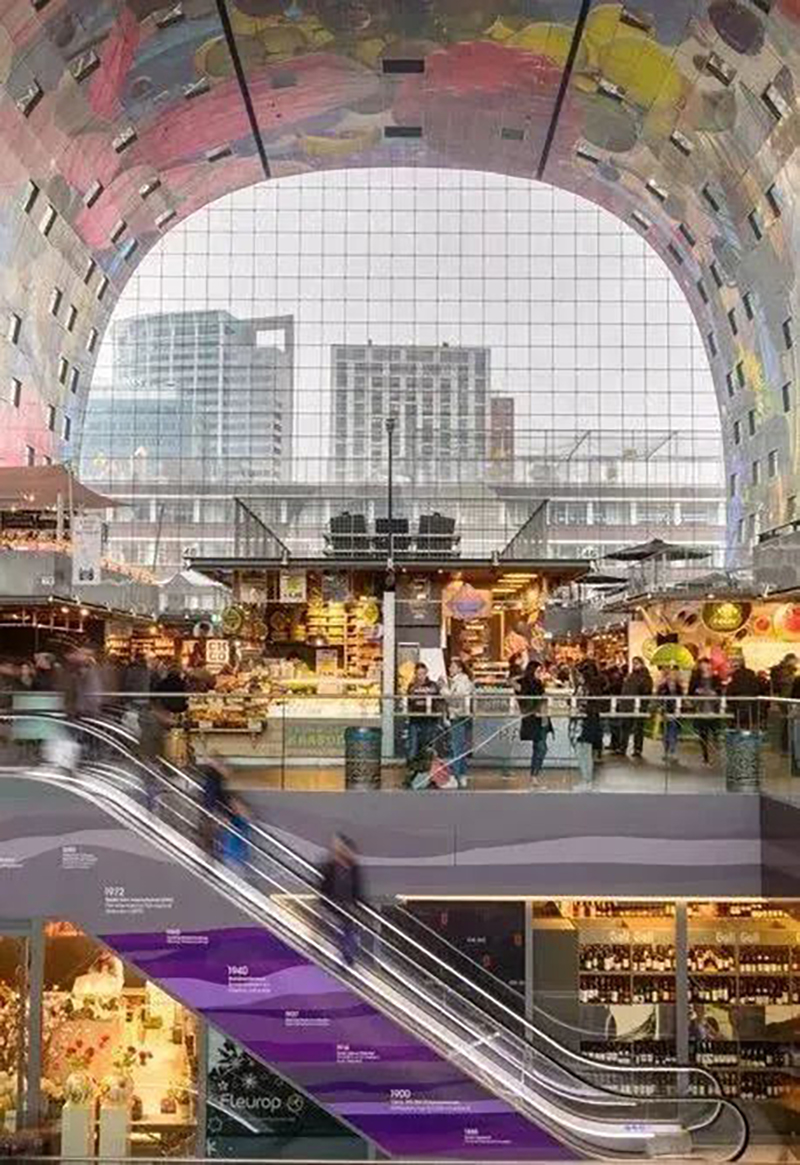 建筑弧形的內(nèi)面11000㎡的彩色藝術(shù)品“豐饒之角”,是由Arno Coenen和Iris Roskam創(chuàng)作而成,將水果、魚、面包、鮮花與附近的大教堂等元素重疊交織而成。項目除兼?zhèn)鋫鹘y(tǒng)菜市場銷售食材的功能外,消費者還能在“美食市集”享受餐飲的服務(wù)和游逛的體驗,大大滿足人們的訴求。