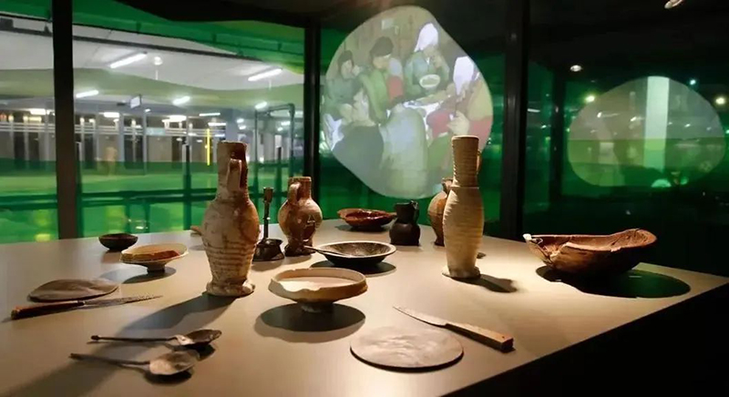 項目舊址在1940年的一次戰(zhàn)爭中歷史建筑都被摧毀,Markthal市場再建設(shè)時,地下考古團隊發(fā)現(xiàn)了各種各樣的中世紀(jì)物品。為予以紀(jì)念,便以垂直展覽的形式在市場內(nèi)的自動扶梯上展示。