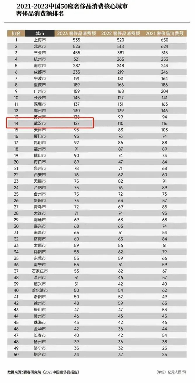 盡管SKP入駐武漢雄心勃勃,但仍面臨諸多挑戰(zhàn)。首要任務(wù)是深度挖掘武漢本地的奢侈品消費潛力,盡管這座城市對新興事物展現(xiàn)出高度興趣,但奢侈品消費文化的培育尚需時日。據(jù)要客研究院《2023中國奢侈品報告》揭示,武漢在奢侈品消費領(lǐng)域的表現(xiàn)尚屬中游,2021至2023年間消費額位列全國第14,2023年具體消費額達127億元,這一成績不及華中區(qū)域內(nèi)的鄭州,亦落后于同級別的新一線城市成都與長沙,彰顯了SKP在武漢市場擴展的艱巨性與必要性。
