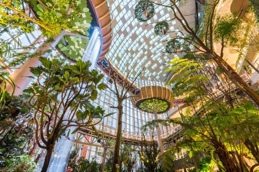 在重慶光環(huán)的深處,自然與商業(yè)的邊界被徹底打破。位于中央的15米高“生命之樹”(鳳凰木)巍然矗立,與20多米的“花之瀑谷”及40米高空的“懸浮森林”共同繪制出三大夢(mèng)幻場(chǎng)景。瀑布水幕高約25米,水流如絲,與來自全球的300余種、數(shù)萬株熱帶雨林植物交織成一幅生動(dòng)的自然畫卷,讓商業(yè)空間煥發(fā)出勃勃生機(jī)。四季更迭,植物園內(nèi)景致各異,每一季都有新的色彩與故事等待被發(fā)現(xiàn)。