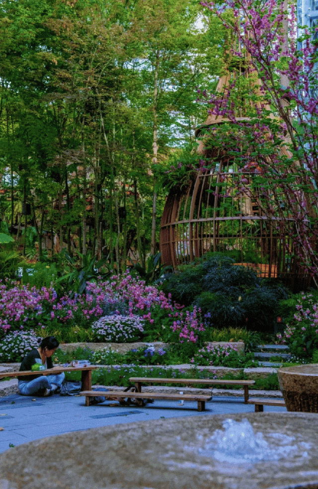 綠樹蔥蘢、繁花似錦,配合匠心獨(dú)運(yùn)的休憩布局,共同編織出一個(gè)遠(yuǎn)離塵囂的森系都市綠洲。然而,若要深入探討森系商業(yè)背后的成功秘訣,僅僅依靠視覺上的高顏值是遠(yuǎn)遠(yuǎn)不夠的。更為核心的是,它必須能夠塑造出一種獨(dú)一無二的文化氛圍與精神內(nèi)核,這種獨(dú)特的文化氣質(zhì)與靈魂,才是讓顧客心生向往、流連忘返的關(guān)鍵所在。