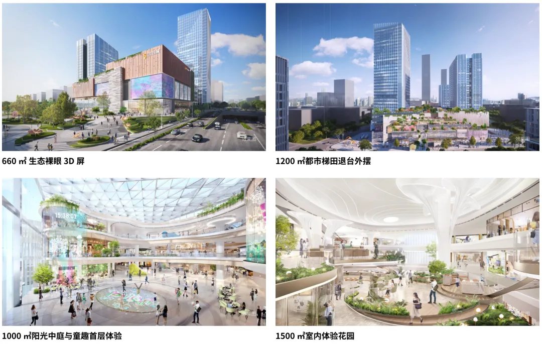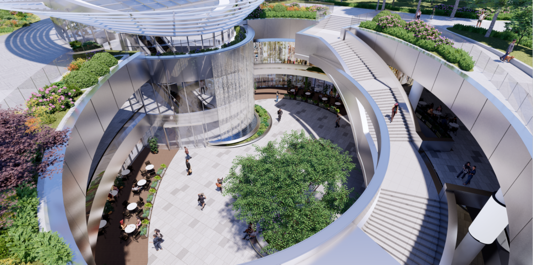 項(xiàng)目設(shè)計(jì)了若干下沉廣場(chǎng),將地下空間向城市和公園界面開放,打造具有生態(tài)層次感的庭院-花園-公園,從而實(shí)現(xiàn)地下-地面-屋頂?shù)娜讓涌臻g規(guī)劃。不僅給到了項(xiàng)目和品牌乃至這個(gè)城市更多的場(chǎng)景敘事和想象空間,同時(shí)也給消費(fèi)者帶來(lái)了更多更豐富的社交空間、沉浸體驗(yàn)空間,最終打造了一個(gè)完美的生態(tài)場(chǎng)域。