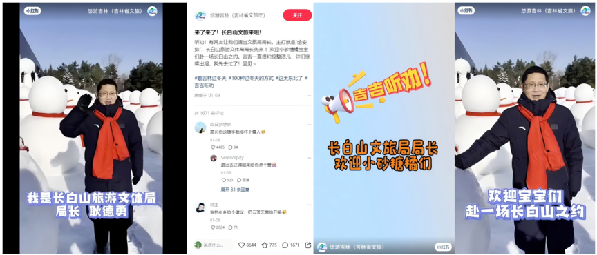 后有網(wǎng)友喊話“快讓長白山跟一波熱度”,吉林文旅現(xiàn)場“搖人”,長白山旅游文體局局長隨即拍攝歡迎視頻,再次實戰(zhàn)“聽勸式營銷”。