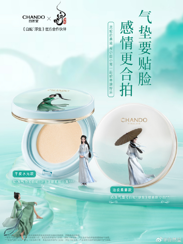 在2024年,《白蛇3:浮生》不僅打破了七夕檔期動畫電影的累計票房紀(jì)錄,而且白蛇IP還借此機(jī)會與金石盟珠寶、北京一卡通、YHD羊很大、芬蘭珠寶FEO等眾多品牌合作推出聯(lián)名產(chǎn)品。隨著蛇年營銷活動的啟動,《白蛇3:浮生》迎來了聯(lián)名產(chǎn)品的“第二春”。自然堂與《白蛇3:浮生》的聯(lián)名款氣墊推出后,緊接著“自然堂蛇年生肖禮盒”也相繼問世。