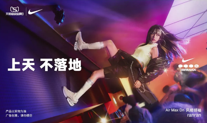 提及“發(fā)瘋”,耐克的「上天不落地」?fàn)I銷大事件也是不得不提一提的。借助新發(fā)布系列的契機(jī),耐克與天貓超級(jí)品牌日牽手,通過與潮流人群共創(chuàng),借助城市文化加強(qiáng)對(duì)潮流藝術(shù)的表達(dá),深度溝通年輕人群,在社交平臺(tái)上號(hào)召網(wǎng)友們玩轉(zhuǎn)“先瘋”穿搭共創(chuàng)。