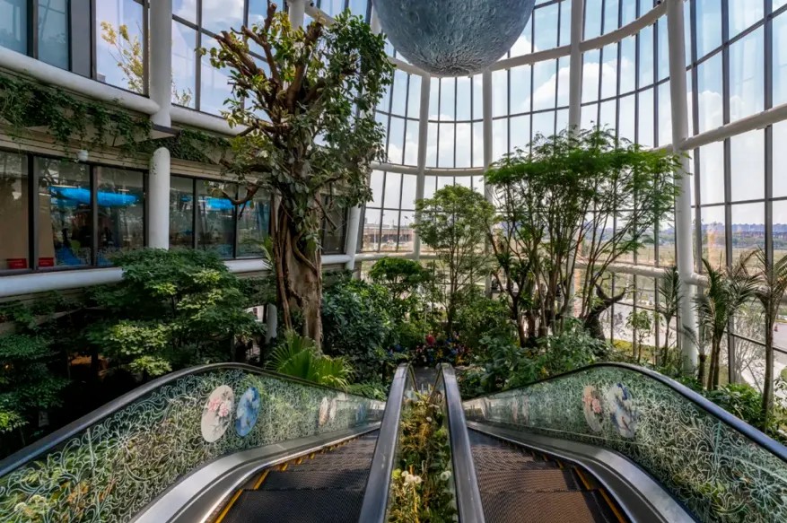 以“一日微度假勝地”為定位的上海南翔印象城MEGA,不僅融合了多元業(yè)態(tài),還巧妙地融入了植物園等自然生態(tài)元素。在建筑設(shè)計上,其外立面以“梯田山丘”為靈感,打造出上海罕見的退臺花園;在商場內(nèi)部,創(chuàng)造性地引入了森林、濕地等自然景觀,構(gòu)筑了一座占地約600平方米、高達5層、擁有200多種國內(nèi)外植物的跨層生態(tài)植物園。