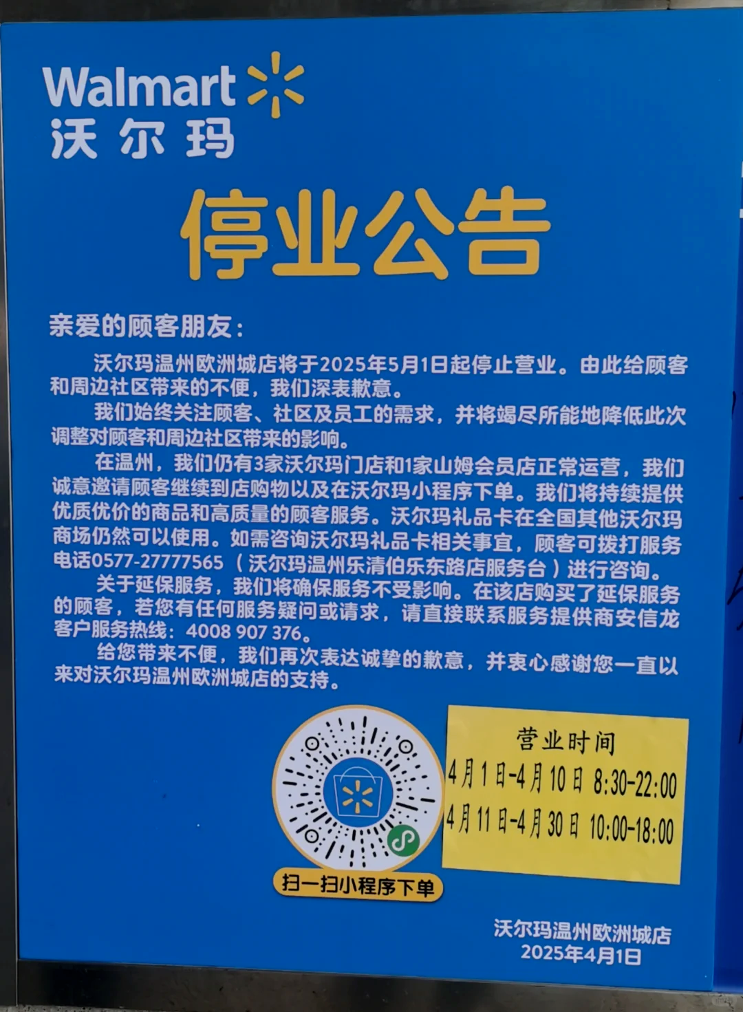 行至2025年,除了如胖東來、山姆等商超企業(yè),超市行業(yè)的生意依然難做。4月1日,沃爾瑪溫州市區(qū)最后一家門店宣布將于5月1日停業(yè),該店是繼沃爾瑪東海店、沃爾瑪鴻瑛店之后,溫州市區(qū)營業(yè)的唯一一家實體店。在關(guān)閉門店的公告中,沃爾瑪明確表示,關(guān)店原因主要?dú)w結(jié)為戰(zhàn)略調(diào)整以及合同或租約到期。其中廣州新港店,由于所在商城整體改造升級,預(yù)計今年10月將重新開業(yè)。